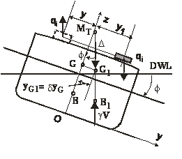 La deplasarea transversala a unei greutati, se modifica pozitia centrului de greutate G si a centrului de carena B. Deplasarea centrului de carena se datoreaza modificarii formei carenei in urma inclinarii transversale a navei. Inclinarea sau bandarea navei apare datorita momentului interior produs de deplasarea transversala a greutatii. Ordonatele greutatilor dinspre bordul babord sunt negative, conform sistemului de axe, de asemenea inclinarile in bordul babord sunt negative. Nava inclinata este in echilibru static deoarece cele doua forte (forta de greutate si forta de impingere) sunt situate pe aceeasi verticala (fig. 2.19).