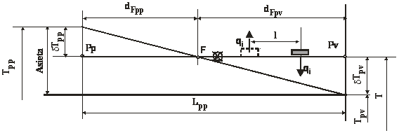 din care se determina variatiile de pescaje din prova si pupa. Adaugate la pescajul initial, in acest caz considerand plutirea dreapta, se obtin pescajele prova si pupa