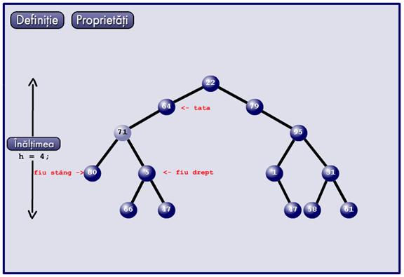 arbore cu radacina radacina arborelui arbore binar arbore binar plin arbore binar complet nivel al unui nod īnaltimea unui arbore tatal unui nod fiul stāng al nodului fiul drept al nodului |