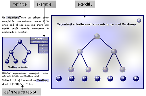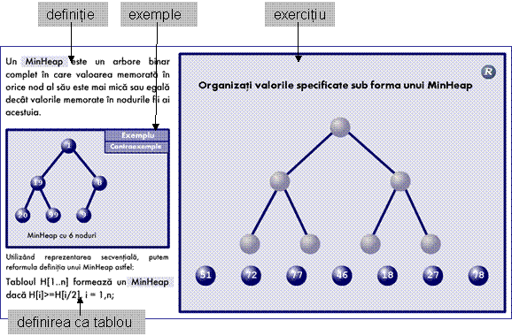 Īn acest obiect de continut este prezentata notiunea de MinHeap. Fereastra este īmpartita īn mai multe zone: definitia, exemple, exercitiu, definirea MinHeap-ului ca tablou.