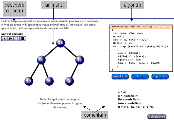 Īn acest obiect de continut este prezentat algoritmul de inserare a unui nou nod īntr-un heap creat anterior. Fereastra este īmpartita īn mai multe zone: descrierea algoritmului īn limbaj natural, animatia, algoritmul īn pseudocod, C++ sau Pascal, zona de comentarii. Zona de comentarii este si ea īmpartita īn doua: comentariile care īnsotesc animatia respectiv variabilele care intervin īn algoritm si valorile pe care acestea le iau pe parcursul desfasurarii algoritmului.