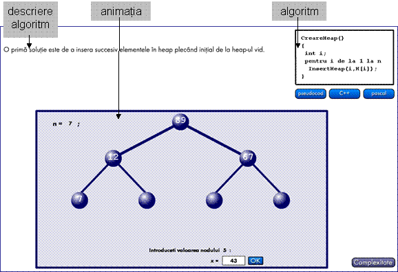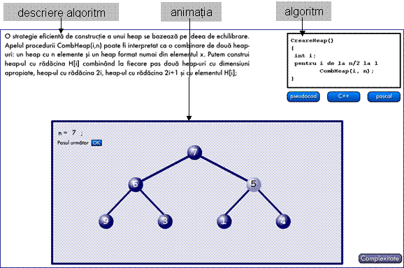 Īn acest obiect de continut este prezentat algoritmul de creare a unui heap prin combinari repetate de heap-uri conform algoritmului descris īn obiectul de continut 3.7. Fereastra este īmpartita īn trei zone: algoritmul īn limbaj natural, animatia, algoritmul īn pseudocod (C++, Pascal). Initial, īn fereastra unde se va desfasura animatia exista doar solicitarea de a introduce valoarea lui n, numarul de noduri, indicāndu-se si valorile corecte care pot fi introduse.