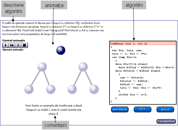 Īn acest obiect de continut este prezentat algoritmul de combinare a unui nou nod cu doua heap-uri create anterior, astfel īncāt sa rezulte tot un heap. Fereastra este īmpartita īn mai multe zone: descrierea algoritmului īn limbaj natural, animatia, algoritmul īn pseudocod, C++ sau Pascal, zona de comentarii.