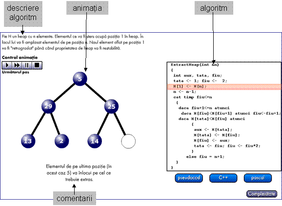 Animatia poate fi controlata īn sensul executarii acesteia īn mod continuu sau īn modul "pas cu pas" pentru a putea fi urmarita fiecare etapa a desfasurarii algoritmului de extragere a unui nod dintr-un heap si refacerea proprietatii de heap. Pe parcursul desfasurarii animatiei, o bara portocalie indica īn fiecare moment instructiunea corespunzatoare din pseudocod (C++ sau Pascal). Īn acelasi timp zona de comentarii se modifica, comentānd ceea ce se īntāmpla.