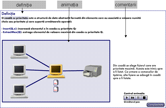 Īn acest obiect de continut este prezentata coada cu prioritate prin intermediul unei aplicatii obisnuite īntr-un laborator de informatica si anume utilizarea unei imprimante de retea. Fereastra este īmpartita īn mai multe zone: definitia unei cozi cu prioritate, animatia, zona de comentarii.