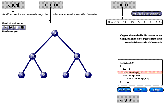 Animatia poate fi controlata īn sensul executarii acesteia īn mod continuu sau īn modul "pas cu pas" pentru a putea fi urmarita fiecare etapa a desfasurarii algoritmului heapsort. Pe parcursul desfasurarii animatiei, o bara portocalie indica īn fiecare moment etapa corespunzatoare din pseudocod (C++ sau Pascal). Īn acelasi timp zona de comentarii se modifica, comentānd ceea ce se īntāmpla.