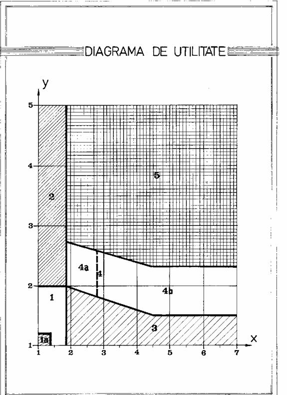 Prin calculul indicatorilor sintetici de pericol se obtin coordonatele (abscisa Xi si ordonata Yi) ale unui punct care este amplasat, de regula, in una din cele cinci zone ale diagramei de utilitate alaturate.