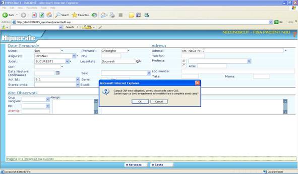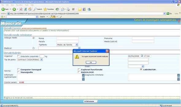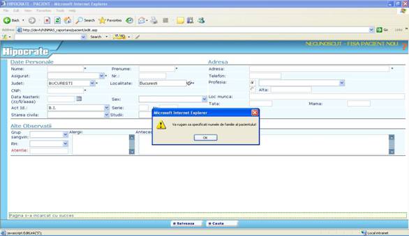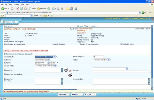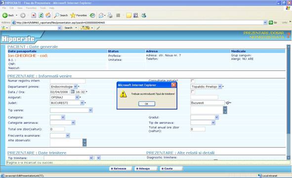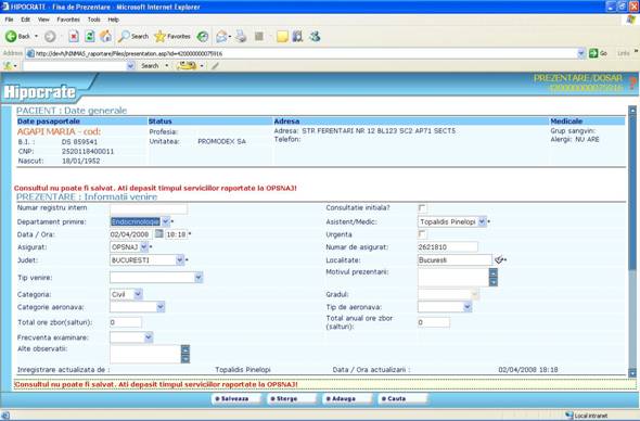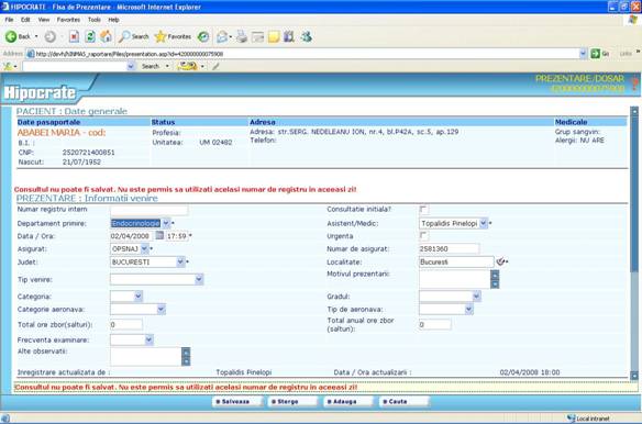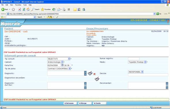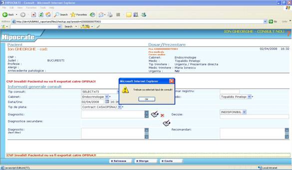 Toate restrictiile pe care le intalniti in aplicatia Hipocrate sunt create pentru ca inregistrarile facute de dumneavoastra sa verifice criter 949c27j iile de invalidare reflectate in „Ordinul ministrului sanatatii publice si al presedintelui Casei Nationale de sigurari de Sanatate nr. 1.781/CV 558/2006 pentru aprobarea Normelor metodologice de aplicare a Contractului-cadru privind conditiile acordarii asistentei medicale in cadrul sistemului de asigurari sociale de sanatate.”