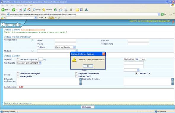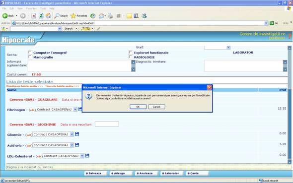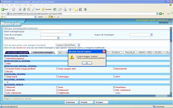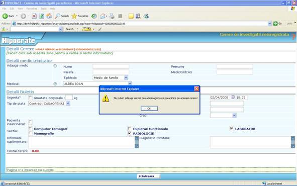 b. Tip analize selectate – nu se poate adauga pe acelasi buletin analize de laborator si radioimagistica