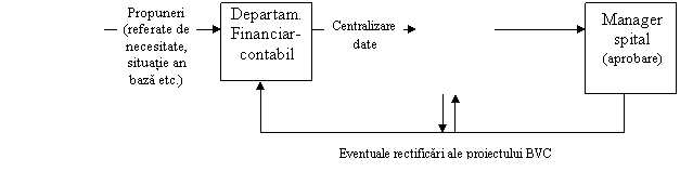 Bugetul de venituri si de cheltuieli se īntocmeste de catre spital īn luna septembrie a anului īn curs pentru anul viitor. Īn martie, se aproba bugetul local de catre primarie si bugetul de stat īn īntregul lui, īn care sunt cuprinsi ordonatorul principal de credite (MSP), ordonatorii secundari, respectiv Autoritatile Judetene de Sanatate Publica si ordonatorii tertiari, spitalele.