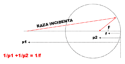Formula oglinzilor sferice concave Se poate demonstra ca unui punct aflat la distanta p1 de varful oglinzii, ii corespunde un punct conjugat (in imagine), aflat la o distanta p2 de varf conform ecuatiei (punctelor conjugate): 1/p1 + 1/p2 = 1/f unde f = distanta focala a oglinzii De aici se poate observa ca pentru un punct aflat la infinit, punctul conjugat va fi localizat in f, ceea exprima faptul ca focarul este punctul de pe axul optic in care converg toate razele provenite de la un punct situat pe axul optic si localizat la infinit. Sa consideram acum un obiect real O, de inaltime i1, aflat in fata unei oglinzi concave, intre centru si infinit, la distanta p1. Se cere sa se afle la ce distanta se va forma imaginea obiectului O si cat va fi de mare in raport cu inaltimea i1.