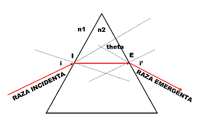 Elementele prismei optice Sa consideram cazul in care o raza incidenta monocromatica, continuta in planul principal, care intra din aer sau vid (caracterizat de un indice de refractie n1), in masa prismei (al carui indice de refractie n2 este intotdeauna mai mare ca n1), intr-un punct numit punct de incidenta, I, sub un unghi de incidenta i in raport cu normala. In punctul I, raza de lumina va fi deviata, mai aproape de normala, conform legilor de refractie.