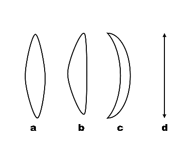 Lentile convergente: a - biconvexa, b - plan-convexa, c - menisc convergent, d - schema lentilelor convergente. Lentilele divergente sunt mai subtiri la centru fata de margini iar un fascicul de raze paralele care o traverseaza devine divergent.