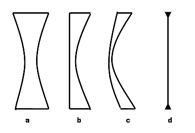 Lentile divergente: a - biconcave, b - plan-concave, c - menisc divergent, d - schema lentilelor divergente.