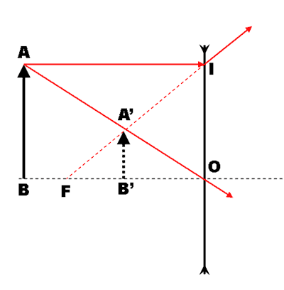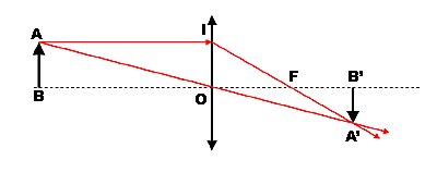 Constructia geometrica a imaginii prin lentile convergente Proiectia punctului A in planul focal, punctul A' se afla la intersectia celor doua raze luminoase emergente din lentila (IFA' si respectiv AOA'). Punctul B' este situat pe axa optica, in mod similar cu punctul B, si se obtine prin coborarea unei perpendiculare din punctul A' pe axa optica. Segmentul A'B' reprezinta imaginea obiectului AB, prin lentila. In functie de