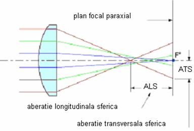 Cu cat raza intra in lentila mai departe de axa optica, cu atat mai aproape de lentila se focalizeaza (intersecteaza axa optica). Distanta de-a lungul axei optice intre punctul de intersectie al razelor care sunt aproape pe axa optica (axa paraxiala) si planul focal (unde se afla F”) se numeste aberatie sferica longitudinala (ALS). Inaltimea la care aceste raze intercepteaza planul focal paraxial se numeste aberatie sferica transversala (ATS). Aceste marimi sunt dependente prin formula: