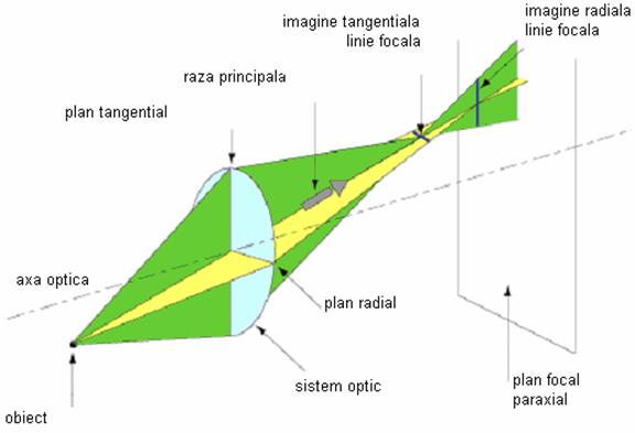 Front de radiatie astigmatic Cand un obiect care nu se afla pe axa este focalizat de lentile sferice, asimetria naturala conduce la astigmatism. In figura de mai jos, planul ce contine atat axa optica cat si punctul in care se afla obiectul se numeste plan tangential. Razele ce se afla in acest plan sunt raze tangentiale, celelalte considerandu-le oblice. Raza principala de la obiect trece prin centrul deschiderii lentilei sau complexului de lentile. Raza principala se mai gaseste si in un plan perpendicular pe cel tangential, numit plan radial. Figura ilustreaza ca razele de la obiect tangentiale se focalizeaza mai aproape de lentila decat se focalizeaza razele din planul radial. Cand se evalueaza imaginea din razele tangentiale, vedem o linie in directia planului radial. Asemanator, cand evaluam imaginea din razele radiale observam o linie in directia planului tangential. Intre aceste doua puncte de intersectie imaginea este ori eliptica, ori circular incetosata (defocalizata). Astigmatismul se defineste ca separatia acestor doua puncte de intesectie.
