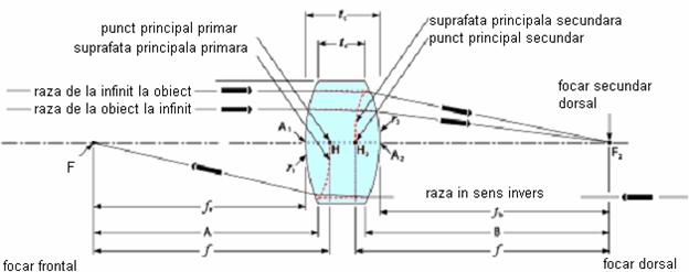 i(i mai mic decat pi/2) a unghiului de incidenta. sin(i) = n2/n1. In consecinta, corpurile asupra carora cade lumina determina: reflexia, refractia si absorbtia radiatiei, fenomene ce au loc simultan. Reflexia poate fi dirijata (ca in cazul oglinzilor, utilizate inclusiv in aparatele foto reflex), sau difuza (reflexia se face in toate directiile, ceea ce permite vederea lor si inregistrarea in fotografii). Refractia poate fi, de asemenea dirijata (sticla, lentile) sau difuza (de exemplu geamul mat). Absorbtia poate fi uniforma pentru toate lungimile de unda ale radiatiei luminoase (corp gri sau negru) sau selectiva (corpuri colorate). Stigmatismul riguros si aproximativ Gauss