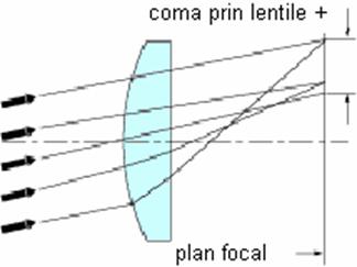 Chiar daca aberatia sferica este corectata si lentila focalizeaza toate razele intr-un punct bine definit pe axa optica, ea tot mai poate sa prezine coma in afara axei optice, ca in figura de mai jos: