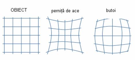 Curbarea imaginii la margini Lentilele pozitive au de obicei tendinta de curbare a imaginii la margini spre interior, iar cele negative spre exterior. Aceasta aberatie poate deci fi ameliorata prin combinatii de lentile pozitive si negative. D i s t o r s i u n e a Panul imaginii se poate nu numai sa fie curbat, dar poate fi si distorsionat. Imagiea unui punct ce nu se afla pe axa optica se poate forma intr-un loc, altul decat cel prezis de teoria paraxiala. Distorsiunea este diferita de coma (unde razele unui punct din afara axei optice nu reusesc sa se intersecteze cu precizie in planul imaginii). Distorsiune inseamna ca, chiar daca imaginea unui punct din afara axei optice se formeaza cu precizie in planul imaginii, locatia sa pe acest plan nu este corecta. Distorsiunea imaginii creste odata cu inaltimea obiectului. Acest efect se prezinta in doua ipostaze: efectul de butoi si efectul de pernita de ace. Acest fenomen nu reduce definitia (rezolutia) sistemului. Inseamna doar ca forma imaginii obiectului nu corespunde exact cu forma obiectului. Distorsiunea este o deplasare a punctului din imagine fata de locatia prezisa de teoria paraxiala in planul imagine si se poate exprima fie ca valoare absoluta fie ca procent din inaltimea imaginii paraxiale.