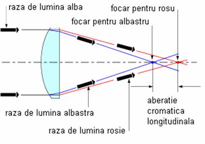 Este evident ca o lentila sau un sistem de lentile are distorsiuni opuse in functie de locul unde se face focalizarea: in fata sau in spate. Deci, daca un sistem optic este folosit pentru a forma o imagine si acelasi sistem este folosit pentru a o proiecta, aberatia distorsiune se anuleaza. De asemenea, un sistem optic perfect simetric cu magnitudine (marire) 1:1 nu prezinta distorsiune sau coma. A b e r a t i a c r o m a t i c a Aberatia sferica, distorsiunea, coma si curbarea imaginii la margini sunt pur functii de forma suprafetei lentilei si sunt observabile cu lumina monocromatica. Exista insa alte aberatii care apar cand sistemele optice sunt folosite pentru a lucra cu lumina de mai multe lungimi de unda. Indicele de refractie al unui material este o functie de lungime de unda. In acest sens, numim dispersie fenomenul in care componentele de diferite lungimi de unda ale luminii policromatice urmeaza directii diferite dupa trecerea prin un mediu cu un indice de refractie n. Deci razele ce compun lumina alba se difracta sub diferite unghiuri, la trecerea prin o lentila de exemplu, deoarece e ca si cum lentila ar pezenta indici de refractie diferiti pentru fiecare raza. In figura de mai jos se ilustreaza un fascicul de lumina policromatica incident pe o lentila pozitiva. Razele de lungime de unda mai mici se focalizeaza mai aproape de lentila decat cele de lungime de unda mai mare. Aberatia cromatica longitudinala se defineste ca distanta axiala dintre focarul cel mai apropiat si focarul cel mai indepartat.