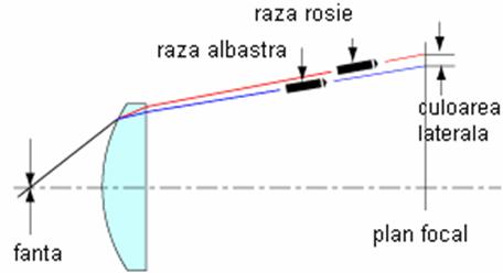 Ca si in cazul aberatiei sferice, lentilele pozitive si negative prezinta tendinte opuse in cazul aberatiei cromatice. Asfel, combinand asfel de lentile cu tendinte opuse pentru a forma un dublet optic, aberatia cromatica poate fi partial corectata. Este necesar sa folosim doua sticle cu caracteristici de dispersie diferite, asfel incat aberatia mai slaba a lentilei negative sa compenseze pe cea mai puternica a lentilei pozitive. C u l o a r e a l a t e r a l a Aceasta aberatie reprezinta diferenta de inaltime a imaginii intre razele albastre si cele rosii. In figura de mai jos se ilustreaza o raza principala ce trece prin un sistem optic cu deschidere (fanta) separata de lentila. Datorita variatiei indicelui de refractie cu lungimea de unda, lumina albastra e refractata mai puternic decat lumina rosie, intersectia cu planul imaginii se face in locatii diferite.