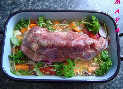 Mod de preparare: Se alege carnea macra de la pulpa sau de la coada.Se sareaza si se tine jumatate de ora.Se aseaza intr-o tava cu ceapa taiata felii subtiri si cu o lingura de untura.Se rumeneste pe o parte si de alta, apoi se toarna cateva linguri de apa si se tine sa fiarba acoperit 1-2 ore adaugand din cand in cand cate putina apa.Cand carnea este fragezita,se unge cu untura si se da la cuptor ,unde se tine descoperita pana rumeneste.Cand este gata se scoate se taie felii subtiri si se tine la cald.Intre timp se face repede sosul:se scurge grasimea din tava,iar in zeama care a ramas ,se adauga 1-2 linguri de apa si putin bullion de rosii.Se lasa sa se dea vreo cateva clocote,amestecand cu lingura,ca sa se ia toata rumeneala de pe fundul tavii.Se serveste cu garniture de macaroane fierte si oparite cu unt sau cu cartofi