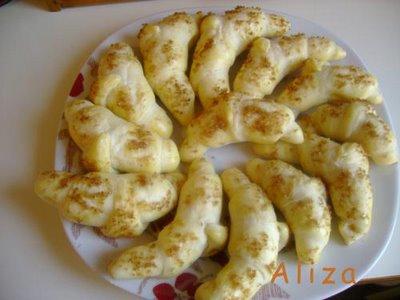 Atat aluatul cat si nuca se pregatesc precum la cozonacul cu nuca.Se intinde pe masa de aluat o foaie cam de un deget grosime.Se taie in forma de triunghi ,de marime dorita.Se intinde nuca pe foaie si se face sul,intorcandu-l de la baza la varf.Capetele se aduc putin spre mijloc,in forma de con.