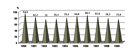 anul 1999, aproximativ 70% din produsul intern brut, (65% in 1990), fiind in scadere