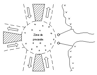 Separarea traficului prin zona de precautie într-o jonctiune se face astfel (v.fig. 14.11):
