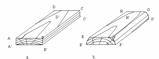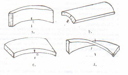 Din punctul de vedere al defectelor de forma ale pieselor de cherestea acestea pot fi: curbura, arcuirea, bombarea si rasucirea, dupa cum se observa in fig 29.