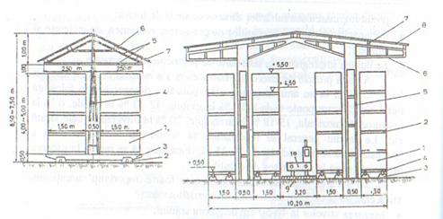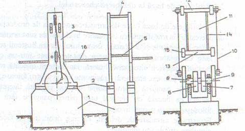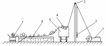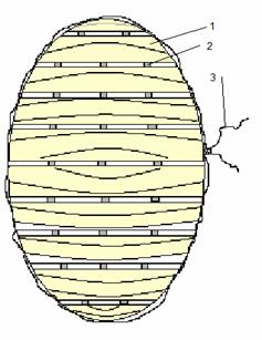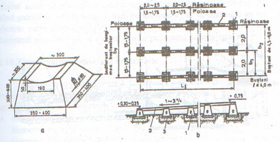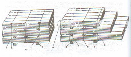 Fig 28. Debitarea pe bulzi: 1-piese de cherestea; 2-sipci de stivuire; sarma de fixare