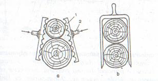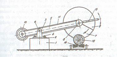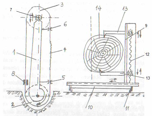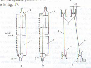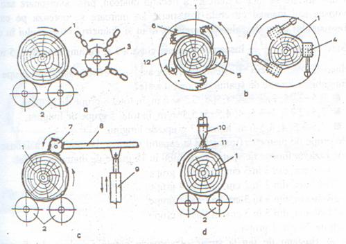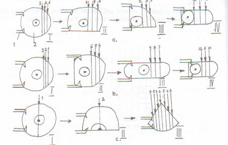 Fig.27. Debitatea cu ferastraul panglica: a-cu intoarceri la 90 0 ; b-cu intoarceri la 180 0; c-debitarea pe sferturi; 1-grife; 2-bustean; .