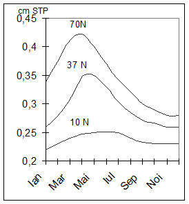 Valorile si variatia lor sezoniera cresc lent cu latitudinea. La latitudini inalte exista un maxim pronuntat primavara si un minim in timpul toamnei (Fig. 5)
