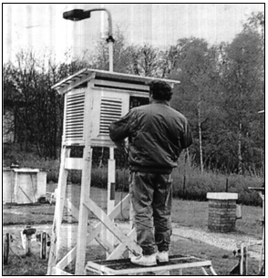 De retinut ca, aparatele pentru masurarea temperaturii aerului si a umezelii sale, ca si cele ce masoara presiunea atmosferica, sunt amplasate in adaposturi meteorologice standardizate a caror inaltime obligatorie trebuie sa fie de 2 m fata de nivelul solului. Masuratorile se efectueaza intotdeauna in conditiile de umbra impuse de “adapostul meteorologic” de lemn si de constructie standard (Fig. 1).