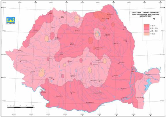Figura 1,abaterile temperaturii medii a aerului din luna ianuarie 2007 fata de norma climatologica