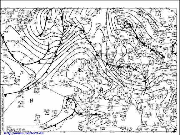 Pornind de la recunoasterea acestor concluzii climatologice(Anomaliile valorilor temperaturii medii lunare pt luna ianuarie la nivel global si abaterile temperaturii medii a aerului din luna ianuarie 2007 fata de norma climatologica)si pentru a determina cauzele care au favorizat o vreme anormala s-a procedat la analiza hartilor sinoptice pentru Europa, de la nivelul suprafetei solului ,zilnic pentru ora 00UTC, urmarind pozitia centrilor barici si circulatia aerului la nivelul Europei si a Romaniei.Cu ajutorul acestor harti s-au delimitat tipurile de situatii aero-sinoptice care au determinat in cursul acestei luni incalziri,respectiv raciri ale vremii pe teritoriul tarii noastre.