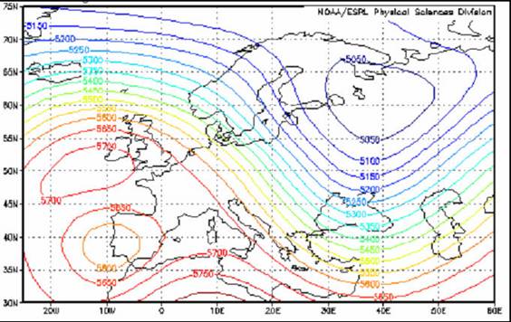 Azore,peste bazinul mediteranean determinand un camp de geopotential ridicat deasupra