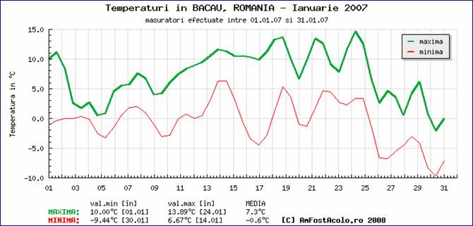Graficile intocmite pentru luna ianuarie 2007 au scos in evidenta o vreme calda cu temperaturi care au depasit mediile multianuale in toate regiunile si s-au evidentiat doua perioade mai reci:una la inceputul lunii, in intervalul 3-5 ianuarie si in ultimile zile ale lunii ,26-31 ianuarie, in timp ce in celelalte zile vremea a fost calda ,uneori chear deosebit de calda(de exemplu in zilele de01,02 la Bacau,06-25 in aproape toata tara)cu valori ale temperaturii aerului mult peste mediile multianuale.