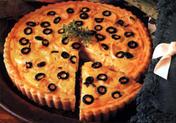 Ingrediente (pentru 8 persoane): 2 cesti faina, 100 g unt taiat bucatele, 6 linguri apa de la gheata, 1 kg ceapa alba taiata rondele, inca 30 g de unt, 1-2 linguri mustar (eventual de Dijon), 1 ceasca smantana acra, 3 oua batute usor, 1/3 ceasca masline negre fara samburi, taiate rondele. Mod de preparare: Se cerne faina intr-un castron, se adauga untul si se freaca intre palme pana ce se obtine o masa sfaramicioasa. Se toarna peste ea aproape toata apa si se framanta un aluat destul de tare. Se pune pe planseta, se mai framanta circa un minut, se asaza intr-o forma rotunda, cu diametrul de 23 cm si apoi se lasa la rece 30 de minute. Se-ncinge cuptorul si se coace aluatul, acoperit cu o foaie de hartie pentru copt, peste care s-au rasfirat boabe de fasole. Dupa 10 minute, se indeparteaza hartia si boabele si se mai lasa la copt alte 10 minute. - Se incinge untul (30 g) intr-o cratita, se caleste ceapa circa 45 de minute la foc slab si se lasa sa se raceasca. - Se unge aluatul copt cu un strat de mustar si se bat bine ouale cu smantana. Se intinde ceapa peste stratul de mustar, se toarna deasupra ouale cu smantana si se presara cu rondele de masline. Placinta se coace aproximativ 35 de minute, pana ce compozitia se intareste. Inainte de-a o taia, se lasa sa se odihneasca 5 minute.