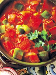 Ingrediente (pentru 4 persoane): 2 linguri ulei de masline, 1 ceapa rosie mare, 2 ardei grasi rosii, taiati cubulete 545m1224f , 1 ardei