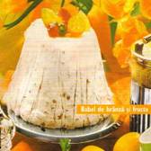 Mod preparare: Etapa I: Stafidele se inmoaie in coniac, iar gelatina se inmoaie in lapte. Se toaca 2/3 din fructe. Etapa II: Galbenusurile se bat cu zahar pudra; se adauga fructele tocate, apoi stafidele, zaharul vanilinat si migdalele, apoi branza de vaci. Gelatina se dizolva in lapte si se inglobeaza in compozitia de branza. Se bate frisca si se omogenizeaza. Etapa III: Se asterne cate un prosop de bucatarie in 2 ghivece noi de lut si se introduce compozitia. Se lasa sa se intareasca in frigider peste noapte. Se 14514p156o rastoarna pe 2 platouri si se garnisesc cu restul de fructe.