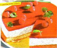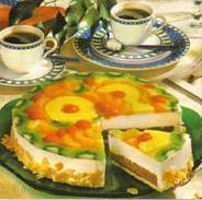 se inglobeaza frisca batuta. Crema se asaza pe blat si se da la rece 3 ore. Etapa V: Se asaza bucatile de fructe. Se prepara glazura dupa intructiuni, se toarna