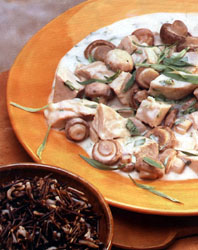 Ingrediente (pentru 5 portii): 1 kg carne de vitel, 1 legatura zarzavat de supa (morcov, patrunjel), sare, 5 boabe de piper, 200 g ciuperci marunte. Pentru sos: 60 g unt sau margarina, 60 g faina, 1/8 l vin alb (sau concentrat de legume), piper macinat, 1 lingurita zeama de lamaie, 1 galbenus, 1 legatura tarhon. Mod de preparare: Se spala carnea, apoi se curata zarzavatul pentru supa, se taie marunt si se pun impreuna la fiert, intr-un litru de apa rece. Se adauga sarea si boabele de piper si se lasa sa fiarba incet aproximativ o ora. Ciupercile curatate se taie in doua sau in patru (cele mai mari). Carnea fiarta se 656h72g scoate din oala si se lasa putin sa se raceasca, iar zeama se strecoara si se pastreaza din ea cam 3/4 l. Pentru sos: Se incinge untul, se adauga faina si se amesteca pana ce se leaga, dupa care se sting cu vin (sau cu zeama fierbinte de legume), amestecand intruna. Se incorporeaza ciupercile si se lasa sa fiarba 7 minute, la foc mic. Carnea taiata bucati potrivite se introduce si ea in sos si se condimenteaza cu sare, piper si zeama de lamaie. Se ia putin sos intr-o ceasca, se amesteca cu galbenusul si se toarna inapoi in cratita, fara sa mai dea in clocot. Jumatate din tarhonul taiat fasii se amesteca in papricas, cealalta jumatate se presara deasupra. Se serveste fierbinte, cu garnitura de orez fiert.