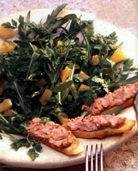 Ingrediente (pentru 4 portii): 2 salate mici, 1 legatura patrunjel. Pentru sosul vinegreta: 2 portocale, 5 linguri ulei de floarea-soarelui, 1 lingura otet de mere, 1 lingurita mustar iute, sare, piper macinat, 4 felii de bagheta, 80 g pateu de ficat. Mod de preparare: Se curata salata, se spala si se taie (se rupe) bucati potrivite. Se aleg frunzele de patrunjel, se spala si se zvanta. Se prepara sosul vinegreta: se curata o portocala de coaja (inclusiv de pielita alba), se desface felii si se taie bucatele marunte. A doua portocala se stoarce, iar zeama se amesteca cu uleiul, otetul si mustarul, se sareaza si se pipereaza. Se aseaza salata verde si patrunjelul pe o farfurie intinsa (eventual pe un platou) si peste ele se toarna sosul vinegreta. Deasupra, se presara bucatele de portocala. Feliile de paine se prajesc, se lasa sa se raceasca, se ung cu pateu de ficat.