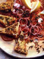Ingrediente (pentru 2 portii): 2 rosii mari (350 g), 1 ceapa rosie, 1/2 lamaie, sare, piper pisat, 200 g branza telemea (de oi), 2 linguri pesmet, 1/2 legatura cimbru, 1 ou, 3 linguri ulei de masline. Mod de preparare: Se spala rosiile si se taie felii foarte subtiri. Ceapa curatata se taie rondele si se aseaza, impreuna cu rosiile si lamaia taiata bucati, pe un platou. Peste rosii se presara sare si piper. Se taie branza felii groase de circa 1 cm. Jumatate din cimbrul tocat se amesteca - intr-un bol - cu pesmetul, iar intr-un alt bol se bate oul. Se dau feliile de branza prin ou si pesmet si se prajesc pe ambele parti in uleiul incins, impreuna cu restul de cimbru (intreg). Se pun apoi peste feliile de rosii, se presara deasupra cimbrul prajit si se servesc cu paine pe vatra sau cu bagheta.