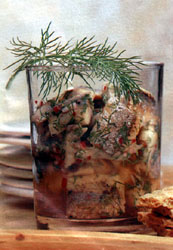 Ingrediente (pentru 4 portii): 6 fileuri de scrumbie (a 60 g), 2 cepe rosii. Pentru marinata: 150 ml otet aromat (cu ierburi), 5 linguri zahar, 6 boabe piper rosu, 1/2 lingurita piper pisat, 2 legaturi marar. Mod de preparare: Se taie fileurile de peste bucati late de circa 2 cm si se aseaza intr-un castron, impreuna cu ceapa tocata marunt. Pentru marinata: Se pun intr-o craticioara otetul, 50 ml apa, zahar, boabele de piper si piperul pisat, se dau intr-un clocot si se lasa sa se raceasca. Se toarna apoi peste peste si se lasa cel putin o ora (sau chiar peste noapte) sa se patrunda bine. Inainte de a servi pestele, se presara deasupra mararul taiat marunt. Ca garnitura: cartofi fierti sau paine neagra unsa cu unt.