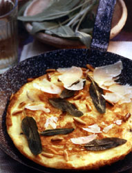 Ingrediente (pentru 3 portii): 1 catel de usturoi, 6 oua, 6 linguri lapte, 40 g parmezan (sau cascaval) ras, sare, piper macinat, 8 frunze de salvie proaspata, 1 lingurita ulei de masline, 1 lingurita unt. Mod de preparare: Se rumeneste usturoiul taiat in doua - fara grasime - dupa care se scoate din tigaie. Se bat ouale cu laptele si se adauga jumatate din parmezanul ras, sare si piper. Se incinge uleiul si se prajesc frunzele de salvie. Jumatate se lasa in tigaie, jumatate se scot si se tin pentru garnisit. Se pune si untul in tigaie, se lasa sa se topeasca, apoi se toarna amestecul de oua si lapte. Se acopera tigaia cu un capac si se lasa omleta sa se inchege, circa 5 minute. Se intoarce (lasand-o sa alunece pe o farfurie plata) si se lasa inca 5 minute, la foc mic. Se presara peste ea restul de parmezan ras si frunzele de salvie ramase si se serveste cu paine de casa si salata.