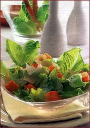 Reteta ii apartine unui italian, Cesare Cardini, din oraselul mexican Tijuana (la granita cu Statele Unite) si s-a raspandit in toata America, unde este considerata o adevarata "poezie". Ingrediente (pentru 4 persoane): 2 catei de usturoi, 160 ml ulei de masline (presat la rece), 100 g parmeza 353i83d n (sau cascaval), 3 fileuri (sarate) de ansoa, 2 galbenusuri proaspete, 2-3 linguri zeama de lamaie, 1 lingurita sos Worcester, sare, piper, 6 felii paine (toast-uri groase de 1 1/2 cm), 2 capatani salata verde (eventual marule - salata cu frunza groasa si creata). Mod de preparare: Se curata cateii de usturoi si se taie in doua. Cu una dintre jumatati se freaca bine castronul pentru salata, restul se piseaza, se amesteca cu uleiul si se lasa sa se patrunda 30 de minute. Jumatate din parmezan se taie fasii subtiri si se pune deoparte, cealalta jumatate se da pe razatoarea mica si se foloseste la prepararea sosului. Se spala fileurile de ansoa cu apa rece, se zvanta, se toaca marunt, se pun in castronul pentru salata si se zdrobesc cu furculita. Se adauga galbenusurile, zeama de lamaie, sosul Worcester, sare, piper si usturoiul scos din ulei. Se freaca bine cu telul si, cand devin ca o crema, se toarna 100 ml de ulei (in care a stat usturoiul), la-nceput picatura cu picatura, pe urma cate-un fir subtire si se bat in continuare pana ce sosul incepe sa se-ngroase. Se incorporeaza parmezanul ras si se mai gusta o data de sare si piper. Se-ncinge cuptorul la 180ĄC, se taie painea cubulete (fara coaja) si se asaza intr-o tava unsa cu jumatate din uleiul (cu gust de usturoi) ramas. Se stropesc cu restul de ulei, se baga la cuptor si se lasa 20 de minute sa se rumeneasca (dupa 10-15 minute se stinge focul, caldura fiind suficienta pentru ca painea sa se rumeneasca frumos). Cand sunt gata, se scot din cuptor. Se curata salata, se spala, se zvanta bine intr-un stergar, se taie bucati potrivite si, inainte de-a o servi, se amesteca usor cu sosul din castron si cu parmezanul. Peste ea se presara crutoanele (cubuletele de paine) rumenite.
