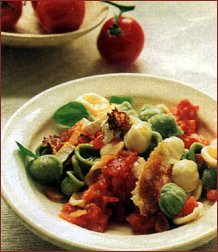 Ingrediente (pentru 4 persoane): 800 g rosii, 1 catel de usturoi, 1 lingurita de oregano, 400 g paste fainoase (melcisori sau scoici), sare, 2 linguri unt, 2 linguri ulei de masline, piper, 30 g seminte de pin, 100 g telemea de oaie. Mod de preparare: Se spala rosiile, se scufunda in apa clocotita, se curata de pielita si se taie marunt. Usturoiul curatat se taie feliute. Se fierb pastele "al dente" in apa cu sare. Se pune la incins o lingura de ulei si una de unt si se caleste usturoiul circa un minut, dupa care se adauga rosiile, oregano, sare si piper si se lasa 5 minute sa fiarba incet. Se incorporeaza pastele fierte si scurse, se amesteca bine si se gusta inca o data de sare si piper. Se incinge restul de ulei si de unt si se rumenesc semintele de pin, care se presara peste melcisori (sau scoici) impreuna cu telemeaua sfaramata.